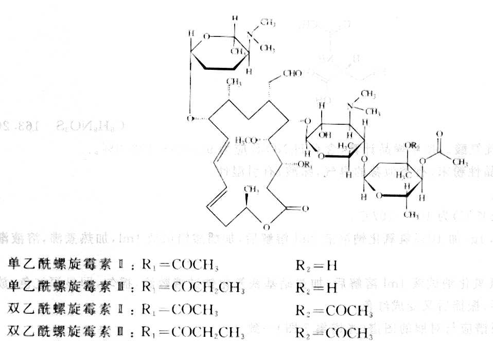 本品為單乙酰螺旋霉素Ⅱ、單乙酰螺旋霉素Ⅲ、雙乙酰螺旋霉素Ⅱ和雙乙酰螺旋霉素Ⅲ四個組分為主的混合物。